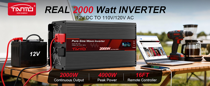 Tianmo car power inverter delivers 2000W of continuous DC 12V 24V 48V to AC 220V 120V power and up to 3000W of peak surge power when the load is started. The car inverter has a great efficiency conversion during normal working and low no-load losses