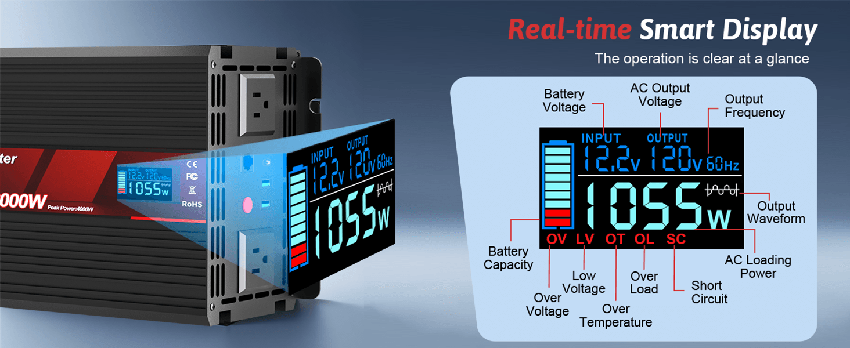 This 2000Watt inverter comes with smart screen and remote control that simultaneously displays input and output voltages, battery and load status, multiple operating conditions for timely troubleshooting.