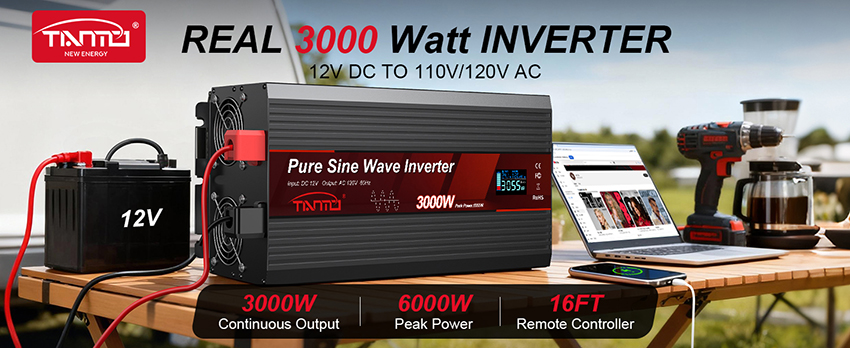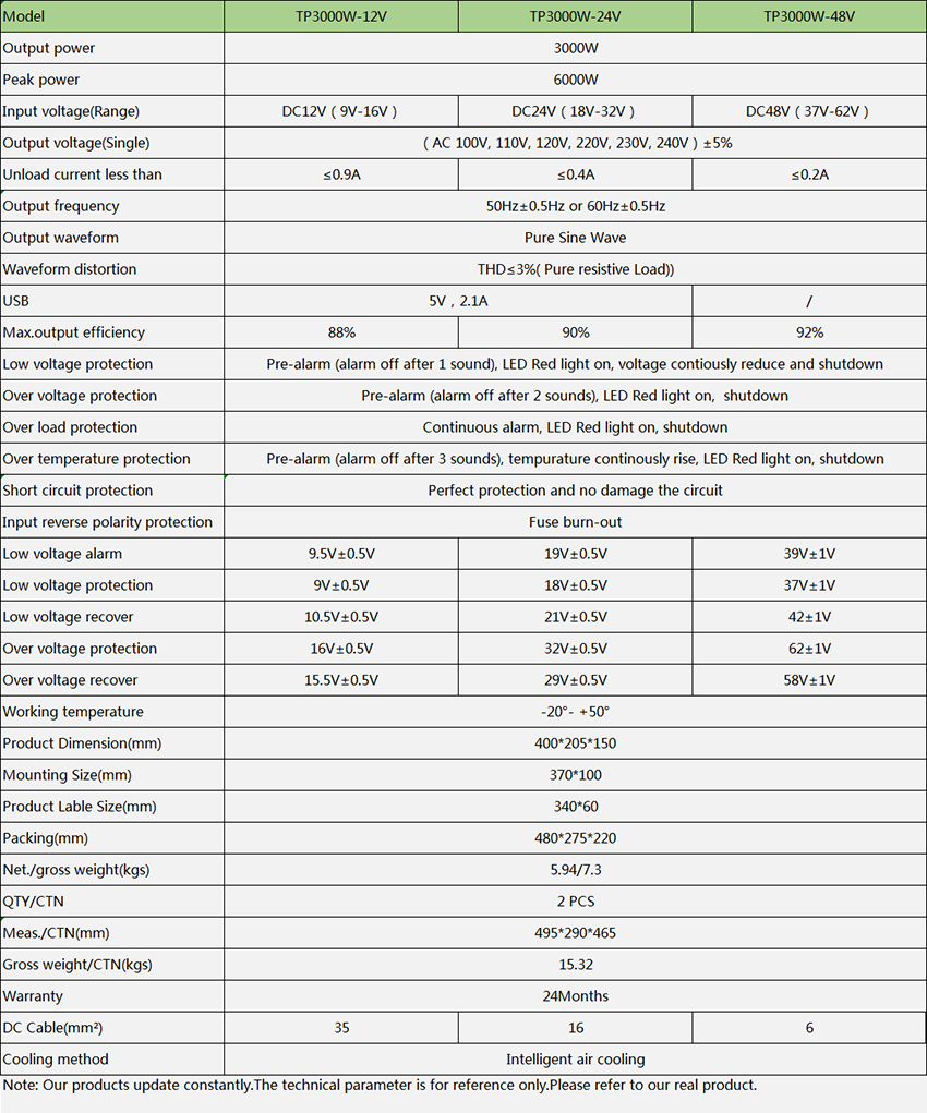 Tianmo car power inverter delivers 3000W of continuous DC 12V 24V 48V to AC 220V 120V power and up to 6000W of peak surge power when the load is started. The car inverter has a great efficiency conversion during normal working and low no-load losses