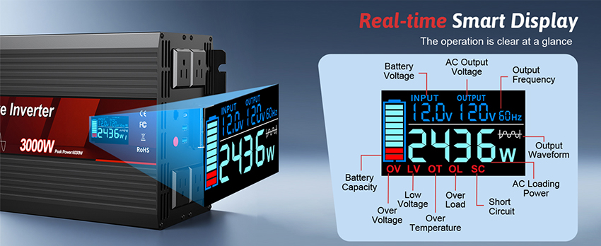 This 3000Watt inverter comes with smart screen and remote control that simultaneously displays input and output voltages, battery and load status, multiple operating conditions for timely troubleshooting.