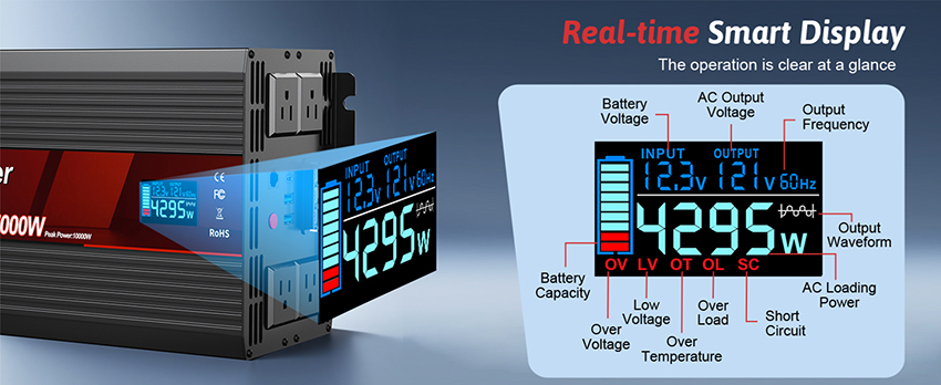 This inverter can efficiently convert 12V DC to 110V/120V AC with 4000W continuous power and 8000W peak power. Adopting advanced pure sine wave technology, the output AC power quality is comparable to utility power, with extremely high conversion efficiency, low energy consumption and low no-load loss. Whether it's for RV camping trips, road trips, van life and other travel scenarios, or for daily use, it can provide stable power supply around the clock.